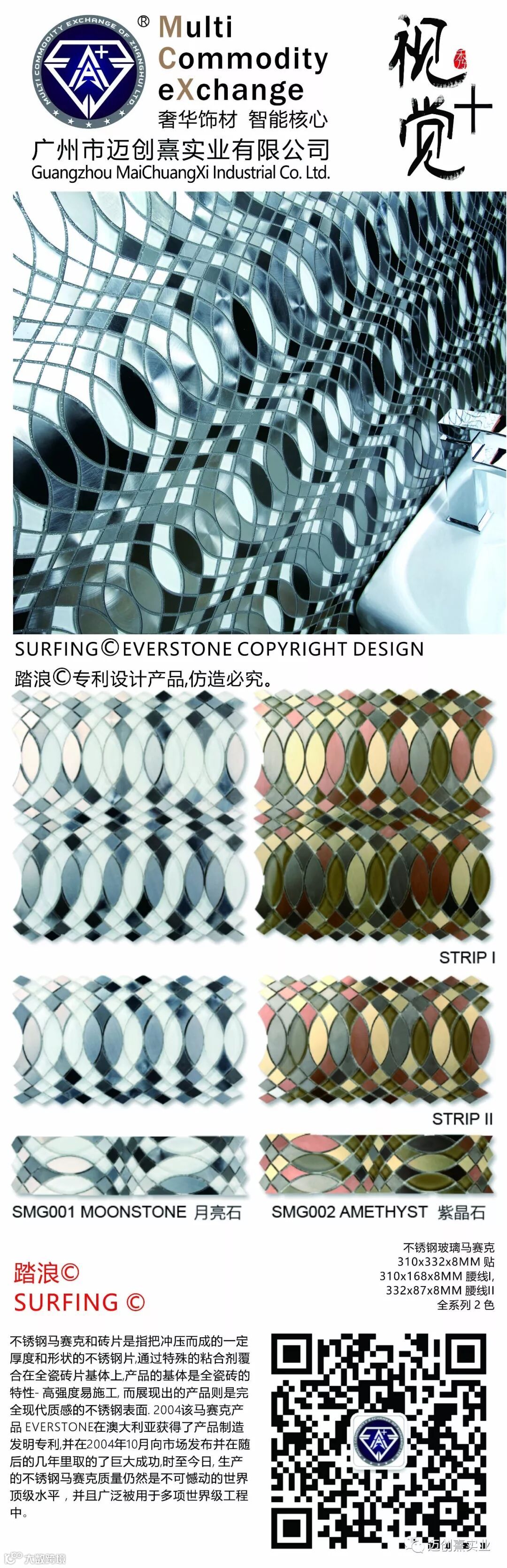 不锈钢马赛克和砖片是指把冲压而成的一定厚度和形状的不锈钢片,通过特殊的粘合剂覆合在全瓷砖片基体上,产品的基体是全瓷砖的特性- 高强度易施工, 而展现出的产品则是完全现代质感的不锈钢表面. 2004该马赛克产品 EVERSTONE在澳大利亚获得了产品制造发明专利,并在2004年10月向市场发布并在随后的几年里取的了巨大成功,时至今日,EVERSTONE所生产的不锈钢马赛克质量仍然是不可憾动的世界顶级水平,并且广泛被用于多项世界级工程中, EVERSTONE 产品的特点和优势是: