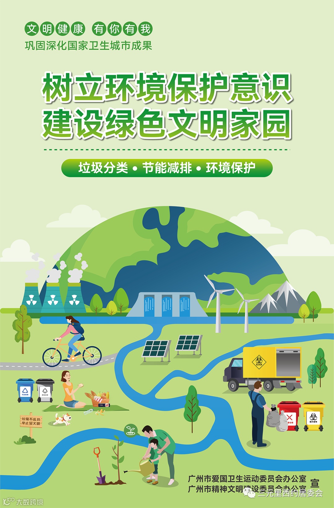 践行环保,争做文明居民。垃圾分类,节约用餐、抵制野味,低