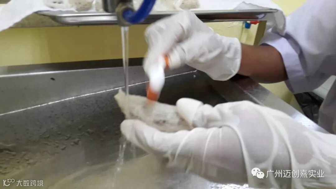 三洗:用手轻轻搅动将部分飘浮的细毛和黑点等杂质漂除。