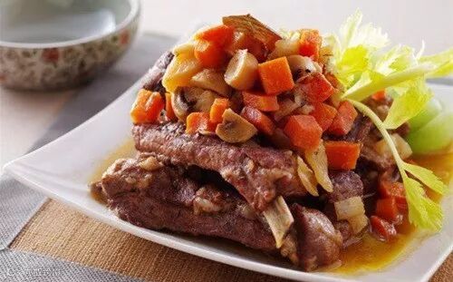 7. 放入切好的洋葱、胡萝卜、番茄酱、月桂叶、百里香、大蒜和少许盐、胡椒,炖煮3至4个小时,最后20分钟将蘑菇倒进去,一起炖煮;
