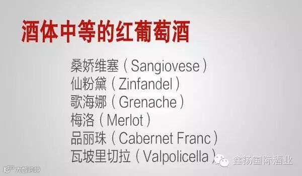 在各种红葡萄酒中,酒体中等的红葡萄酒可以说最容易搭配食物。经典的酒体中等的红葡萄酒包括桑娇维塞(Sangiovese)和梅洛(Merlot)葡萄酒。不过,由于产区和酿酒技术不同,这些葡萄酒当然也会有差异。