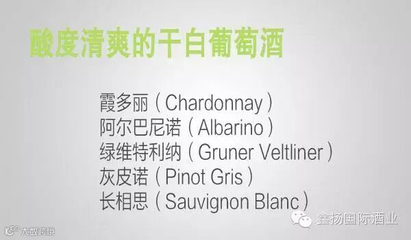 酸度清爽的干白葡萄酒犹如一支清爽的啤酒。为享用到它清爽的果香以及令人垂涎的酸度,酸度清爽的干白葡萄酒需要在年轻时被饮用完(1至2年)。