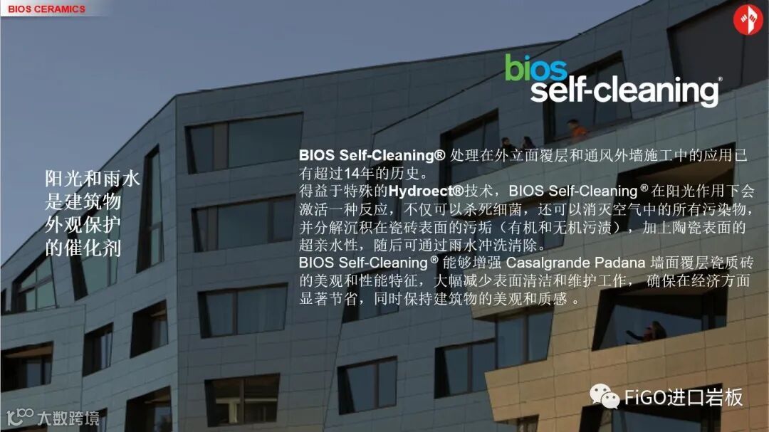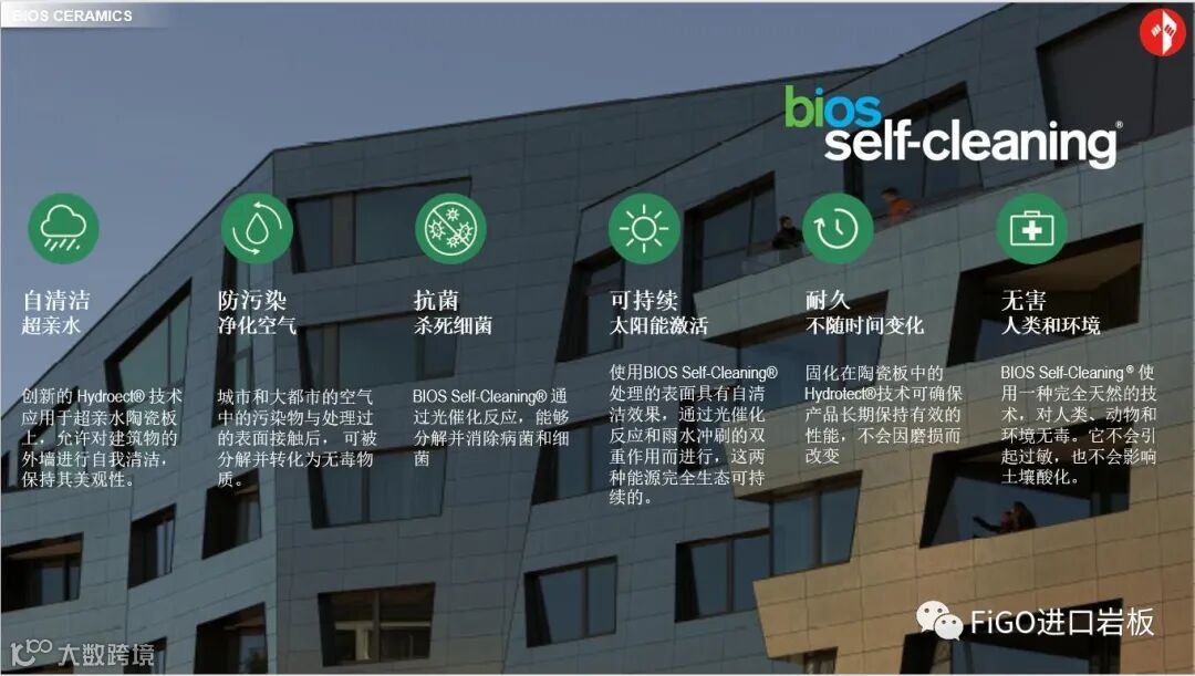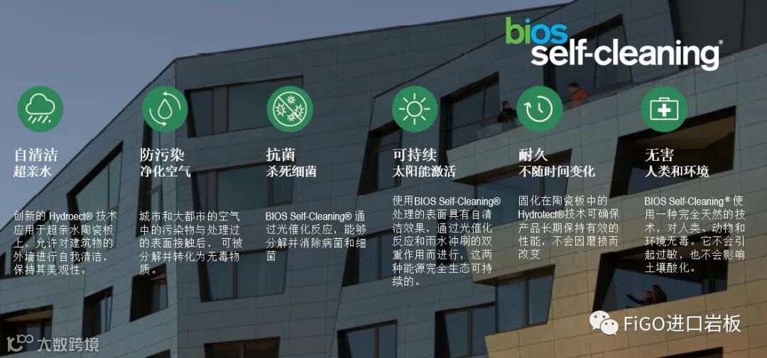 自洁功能适合用于幕墙系统及户外立面,材料只需要接触阳光就能产生化学反应,排斥附着于材料表面的污染物和污垢,使其能轻易被雨水所带走。此专利技术还具有净化空气效果,每1000平方米产品的空气净化能力相等于一个正规足球场大小的森林。