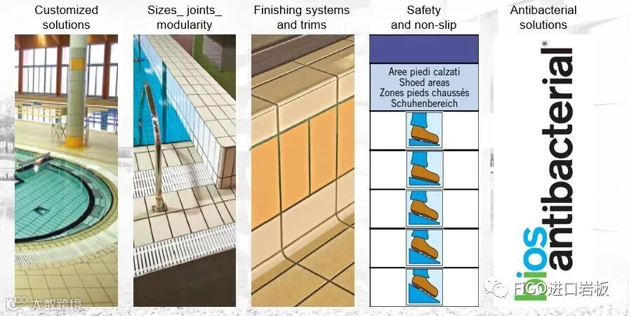 至于表面效果方面,璞丹娜除了提供真实感十足的仿材质处理,如大理石光面和哑面、岩石自然面、木纹肌理、金属质感、水泥触感、花岗岩颗粒感等,还提供功能性极强的R10-R13防滑表面处理。