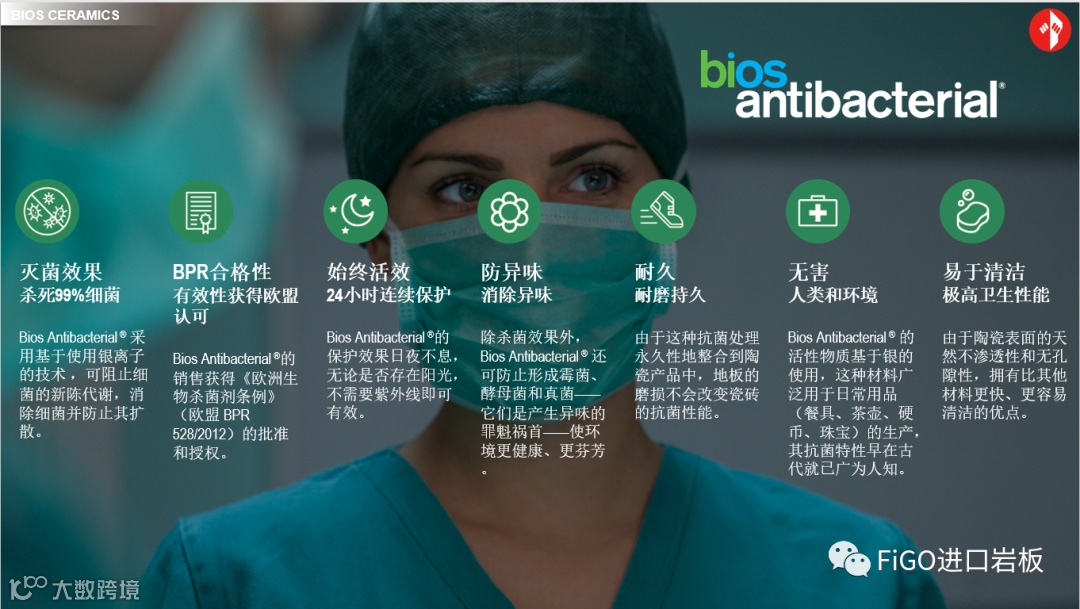 抗菌功能适合用于室内空间,特别是医疗设施、游泳池、酒店和家居等对卫生要求较高的应用场所。有关专利经由权威实验室测试,证实能够消除99%医院环境中四种最常见会造成感染的主要细菌菌株。有别于部分其他牌子施加于材料表面的光催化涂层方式,璞丹娜的抗菌物料于产品烧制前已经融入产品之中,因此并不会因产品的表面被磨蚀而失效,同时抗菌杀菌功能全天候持续生效,并不依赖紫外线激活。
