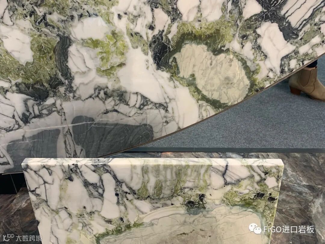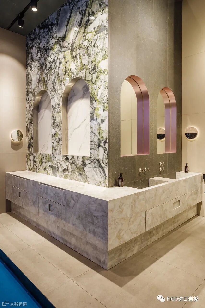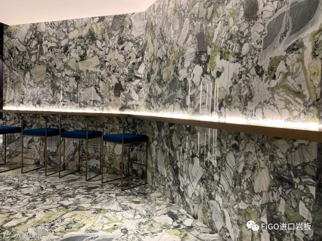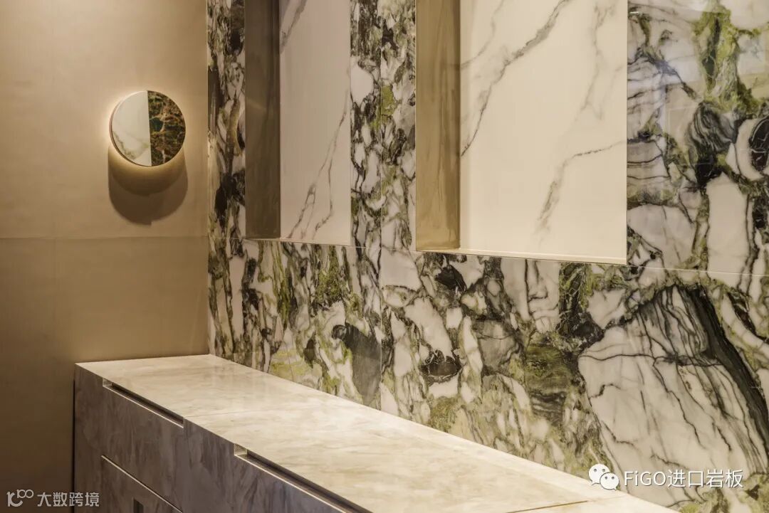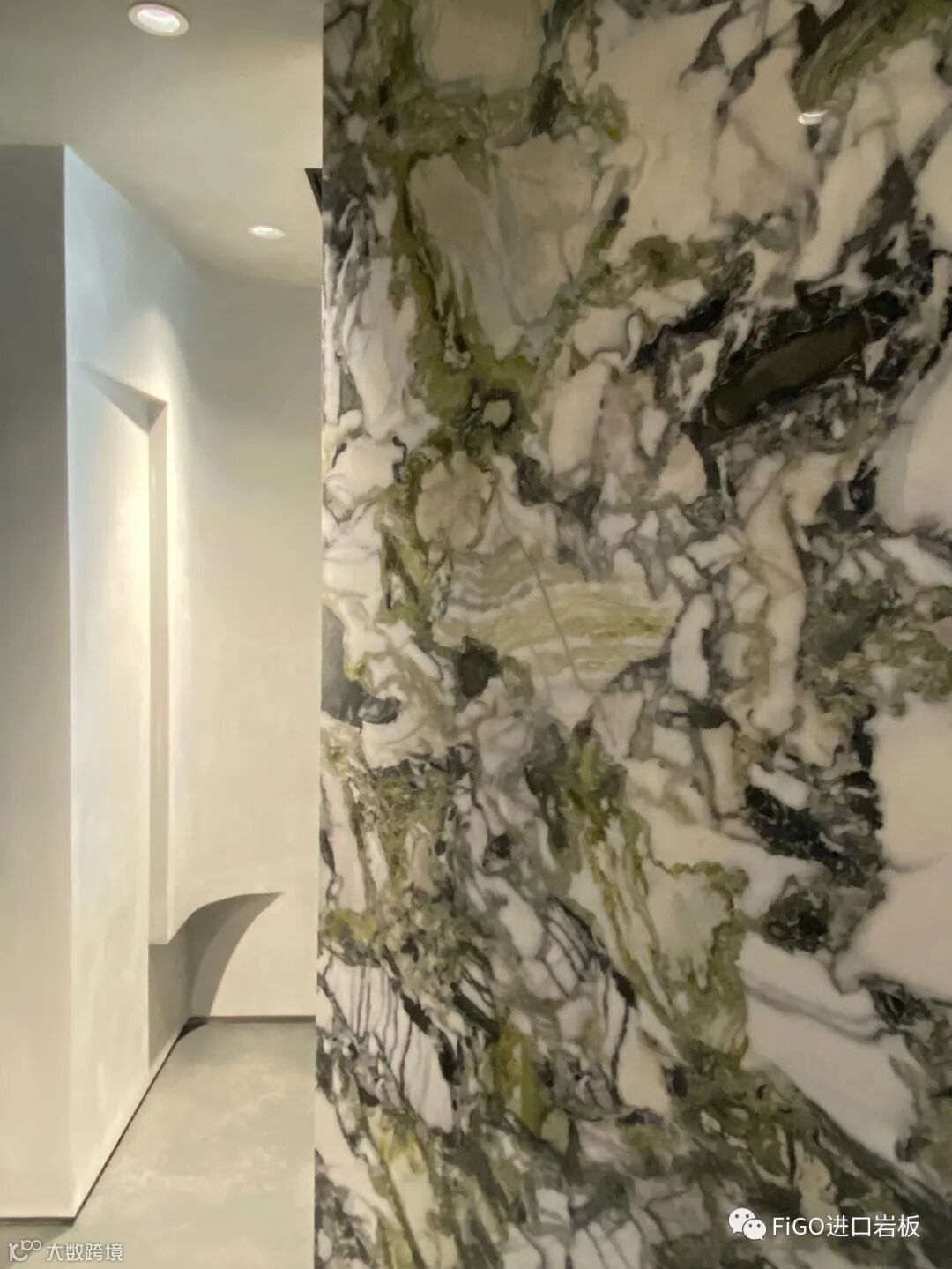冷翡翠之所以这几年在设计圈子流行起来,得力于意大利一家很有名的石材公司Antonlini的推动,这家石材公司喜欢在全世界寻找一些很独特或很小众的品种,经过他们的包装、宣传和推广,在国外主流的设计圈里形成风潮。一如寒江雪(Invisible),当年也是由Antonlini一手推动,使得这些从前不在我们视线范围内的品种,从意大利吹向全球。在上个世纪九十年代,绿色的大理石曾经风靡一时,室内设计多有运用绿色大理石,为当时其中一个时尚和潮流。然而,随着极简设计的兴起,黑、白、灰成了设计的主流,花红花绿的大理石便鲜见于室内设计中。十年一觉,几回魂梦,潮流就像一个大轮回,最近几年,绿色大理石又重新出现于人们的视野之中,先是在欧洲,设计师们重新起用绿色大理石进行设计,受到了一大批人的追捧与喜爱。这股浪潮席卷全球,掀起了一股时尚的热潮。