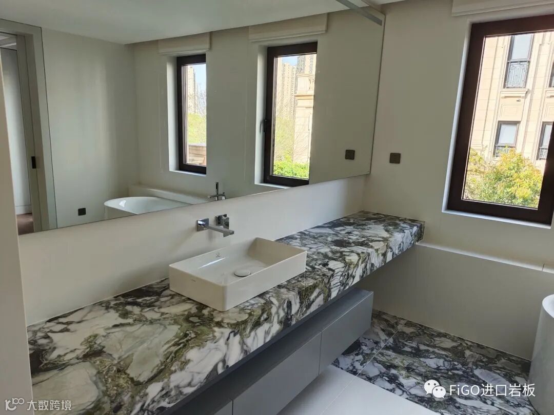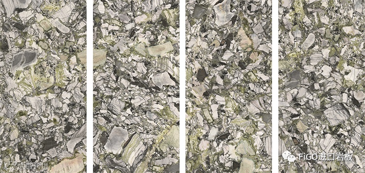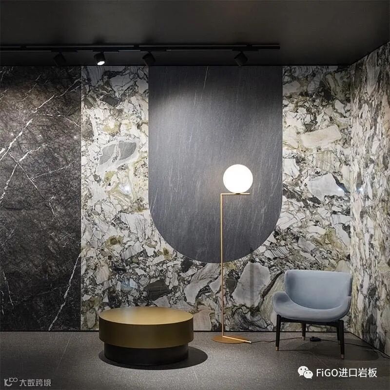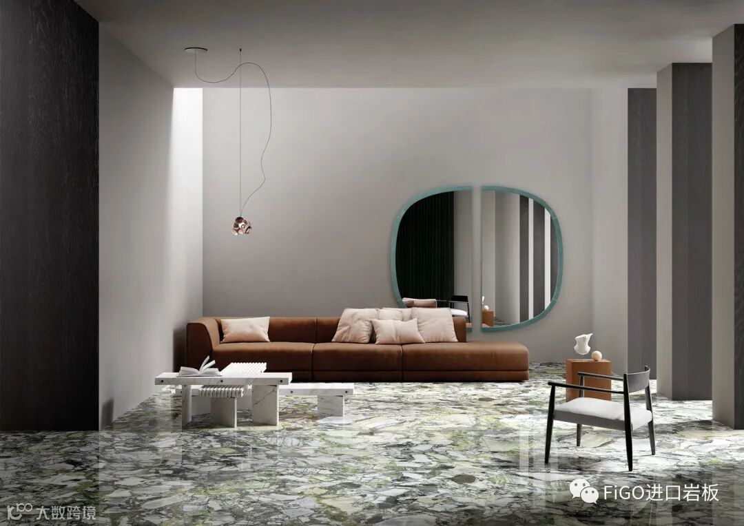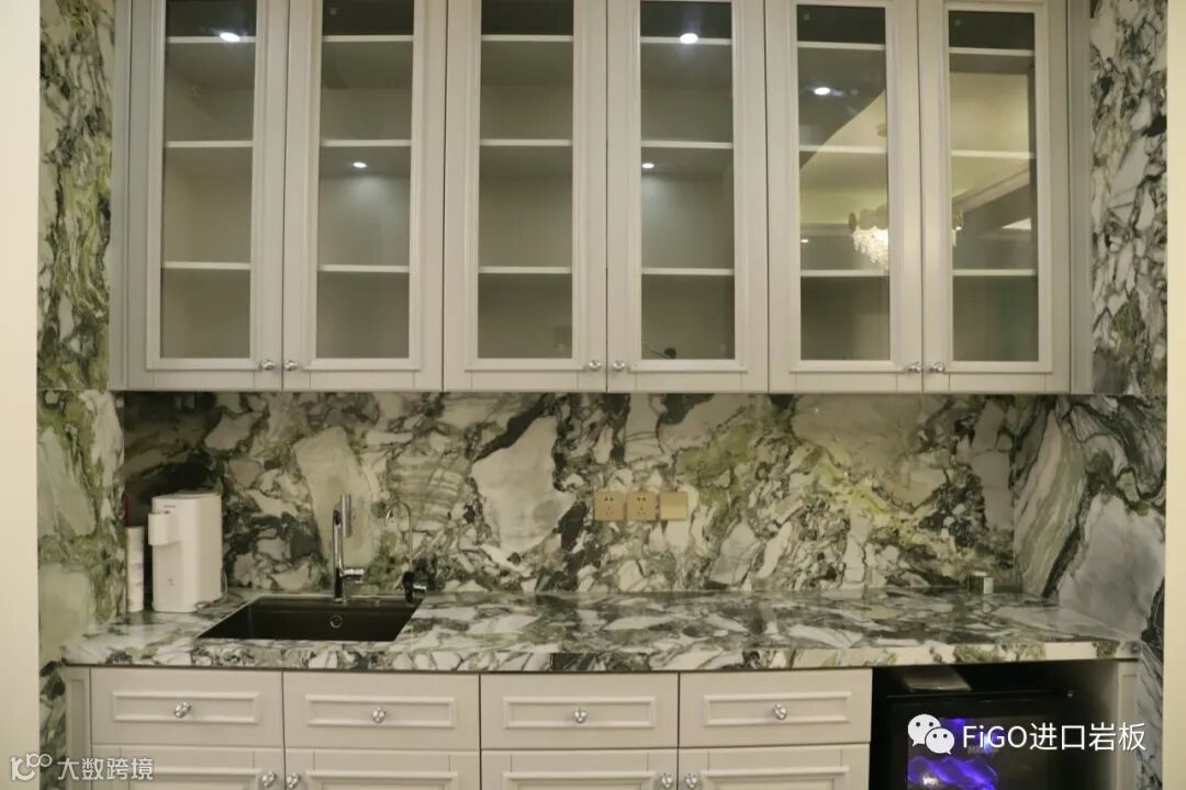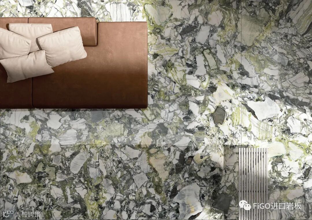 冷翡翠之所以这几年在设计圈子流行起来,得力于意大利一家很有名的石材公司Antonlini的推动,这家石材公司喜欢在全世界寻找一些很独特或很小众的品种,经过他们的包装、宣传和推广,在国外主流的设计圈里形成风潮。一如寒江雪(Invisible),当年也是由Antonlini一手推动,使得这些从前不在我们视线范围内的品种,从意大利吹向全球。在上个世纪九十年代,绿色的大理石曾经风靡一时,室内设计多有运用绿色大理石,为当时其中一个时尚和潮流。然而,随着极简设计的兴起,黑、白、灰成了设计的主流,花红花绿的大理石便鲜见于室内设计中。十年一觉,几回魂梦,潮流就像一个大轮回,最近几年,绿色大理石又重新出现于人们的视野之中,先是在欧洲,设计师们重新起用绿色大理石进行设计,受到了一大批人的追捧与喜爱。这股浪潮席卷全球,掀起了一股时尚的热潮。