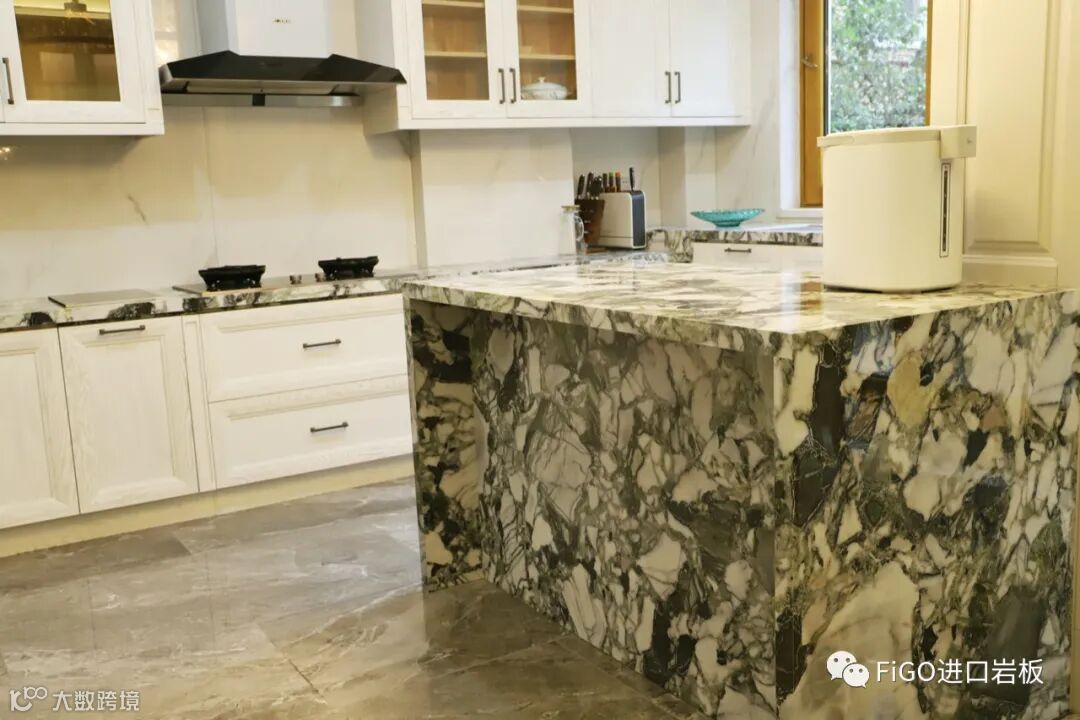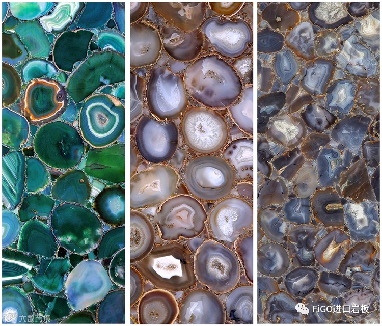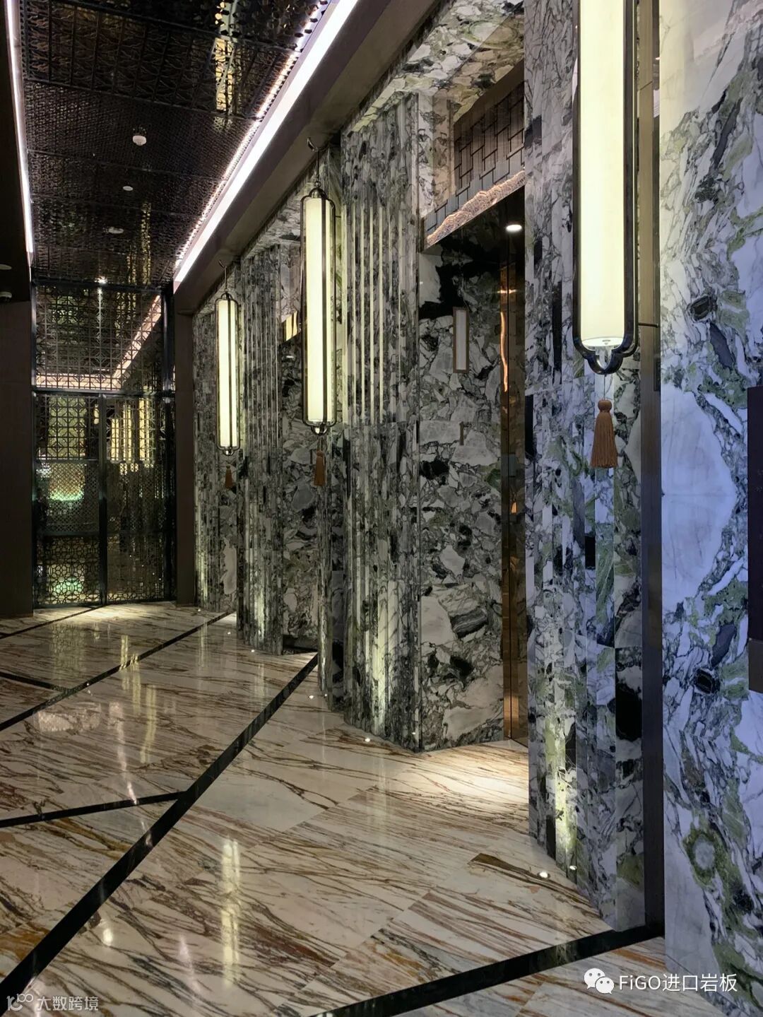 冷翡翠是一种非常独特的大理石,其效果接近于玛瑙类奢石,但不同的是,我们平常看到的玛瑙类奢石都是要靠人工拼贴,一小块一小块的拼贴成大幅的图案,人为加工痕迹比较明显。而冷翡翠则是大自然的鬼斧神工,从矿区天然开采出来就是成品的样子,无需再依靠后天人工拼贴。正因为冷翡翠这个天然的特点,随机性很大,天然出产的大理石荒料可控性很低,难免出现大量质素参差的板面。为满足设计师越来越高的美学要求,要么天价购买相对较好的板面,要么就失望而回。如果要用万里挑一的板面作大范围铺贴,翡安爵完美的冷翡翠岩板是唯一的方案。