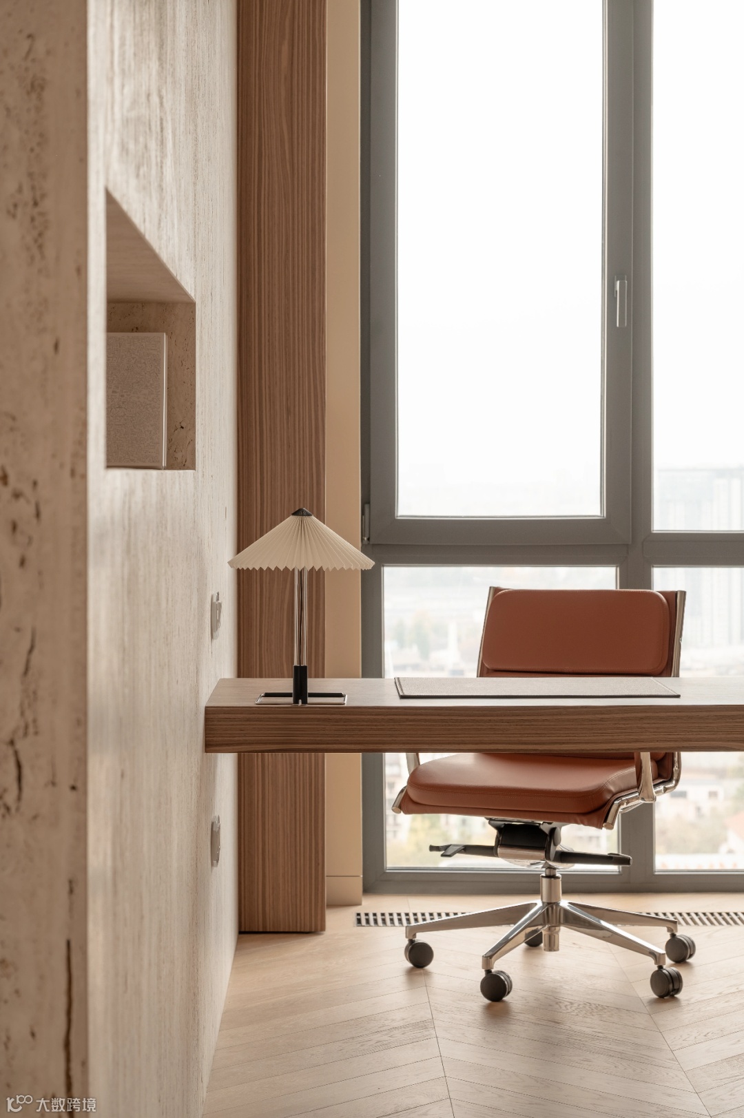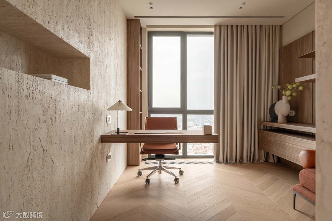 设计上,正如图片所展现的,整体以原木色为基底,搭配低饱和度的中性色作为辅助,没有复杂的造型堆砌,没有多余的色彩点缀,每一处设计都服务于实用与舒适。墙面采用简洁平整的处理,摒弃繁琐雕花与冗余装饰,仅以原木材质的自然纹理作为视觉亮点,搭配利落的直线条,再加上图片中可见的柔和光影,让空间显得开阔通透,自带静谧治愈的氛围感。