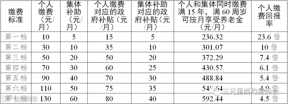 2、集体经济组织可选择其中一档对参保人缴费给予补助,无经济能力的可以不对参保人缴费给予补助;没有集体经济组织或经济组织未给予补助的参保人,可参照集体经济组织补助标准缴费,享受对应的政府补贴。