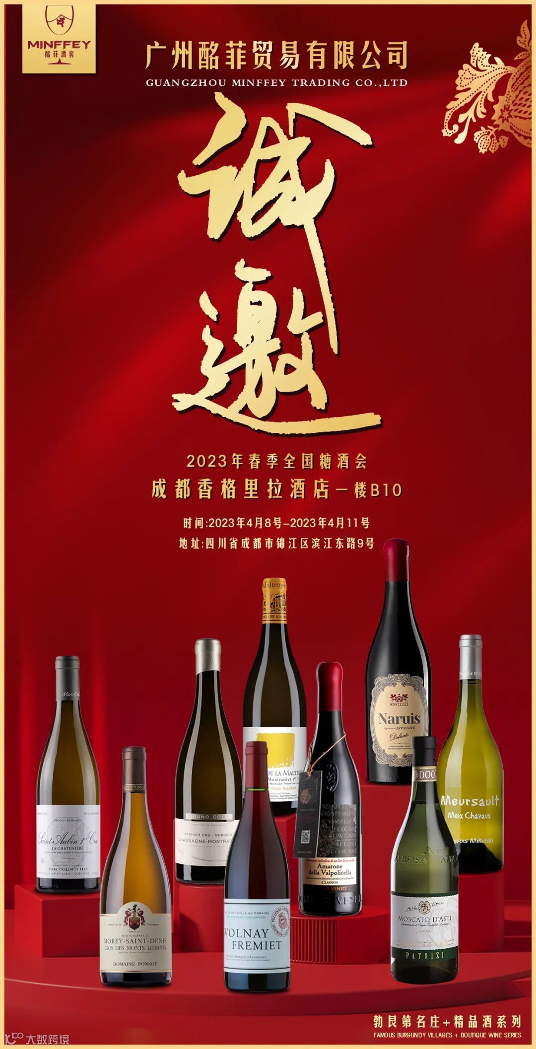 2023年4月8日-11日,成都香格里拉大酒店一楼B10展位,酩菲将携各大主打品、新品惊艳亮相此次盛会。更值得期待的是,酩菲推出勃艮第顶级名庄酒,必将点亮你的春糖之旅。