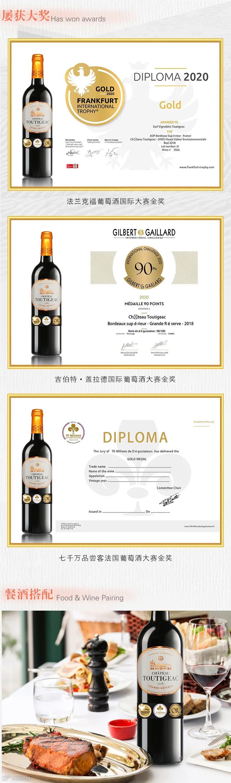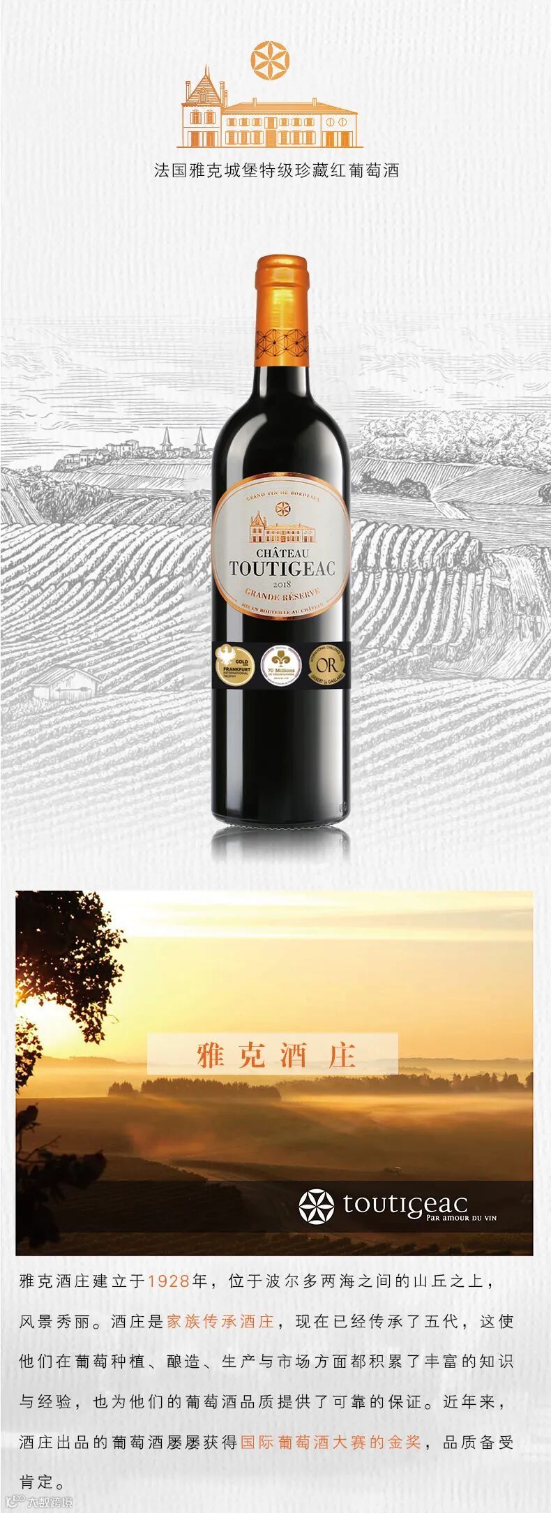 导读:·独立家族酒庄传承五代·法兰克福国际葡萄酒大赛金奖·7千万品尝客法国葡萄酒大赛金奖·吉伯特·盖拉德国际大奖赛金奖
