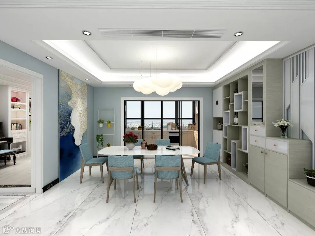 客厅地面大理石白色纹理大板砖延续至餐厅地面、墙面运用波打线、大理石、硬包、软装、柜子、沙发背景墙运动手绘形式定制图案等不同元素组合装饰。