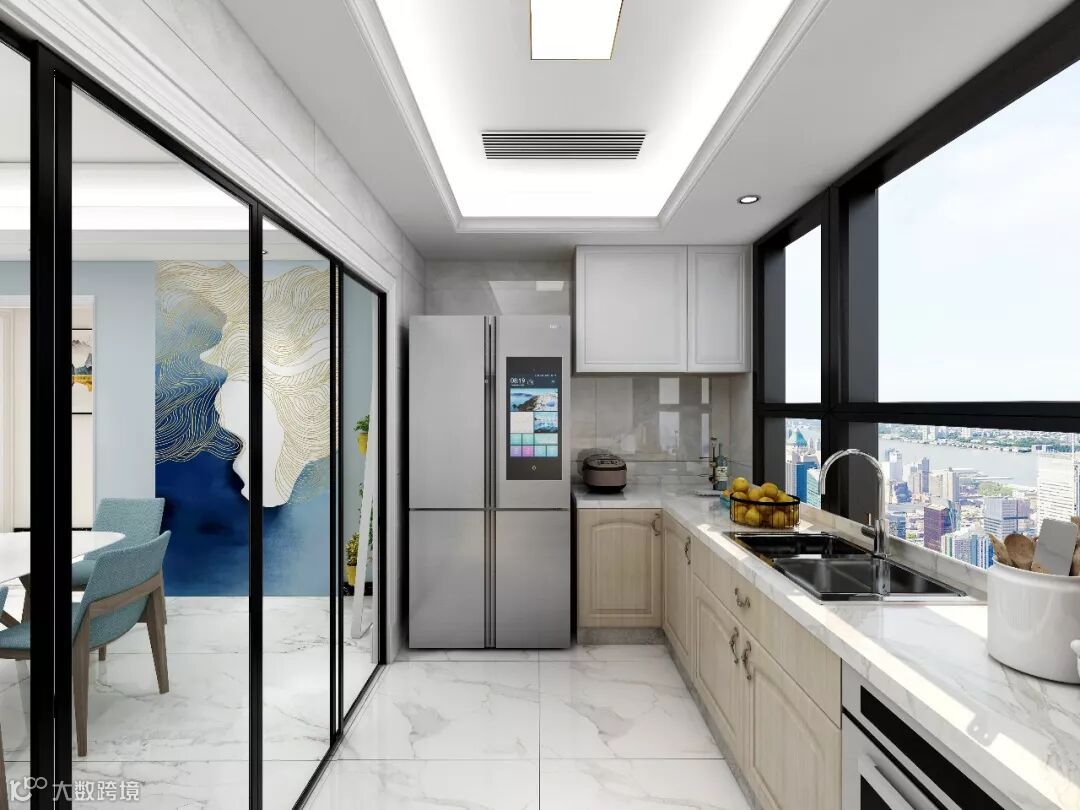 厨房墙地砖都采用大理石纹路的瓷砖铺贴,与原木色多层造型柜门形成强对比反差,打造更加简约硬朗的现代生活感。
