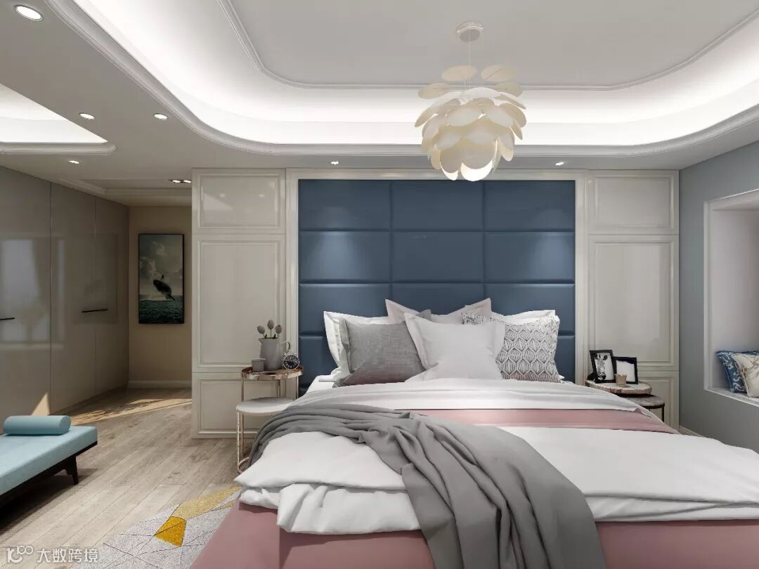 主人房利用了蓝色与白色结合营造出温馨的感觉,花瓣式的吊灯更加符合整个房间的点缀。