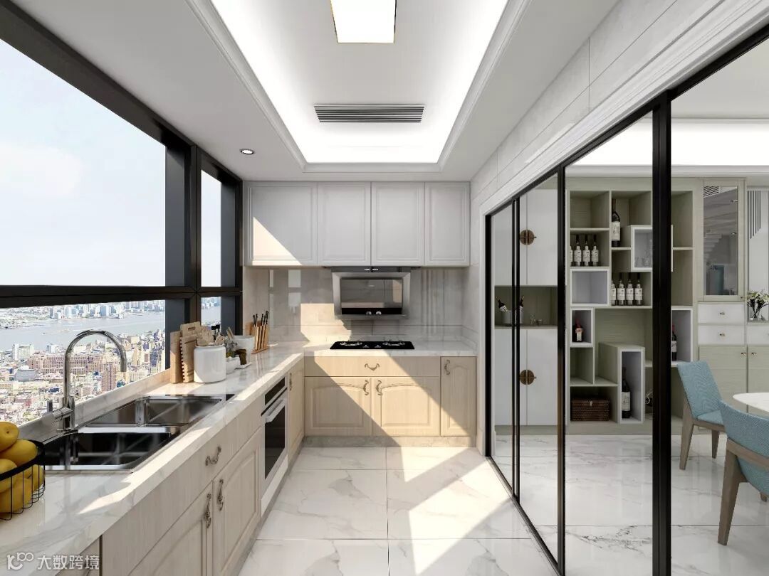 吊柜下方吊顶天花灯带筒灯的加入,能够很好地消除厨房照明死角,同时突出墙面瓷砖的大理石纹路,富有质感。