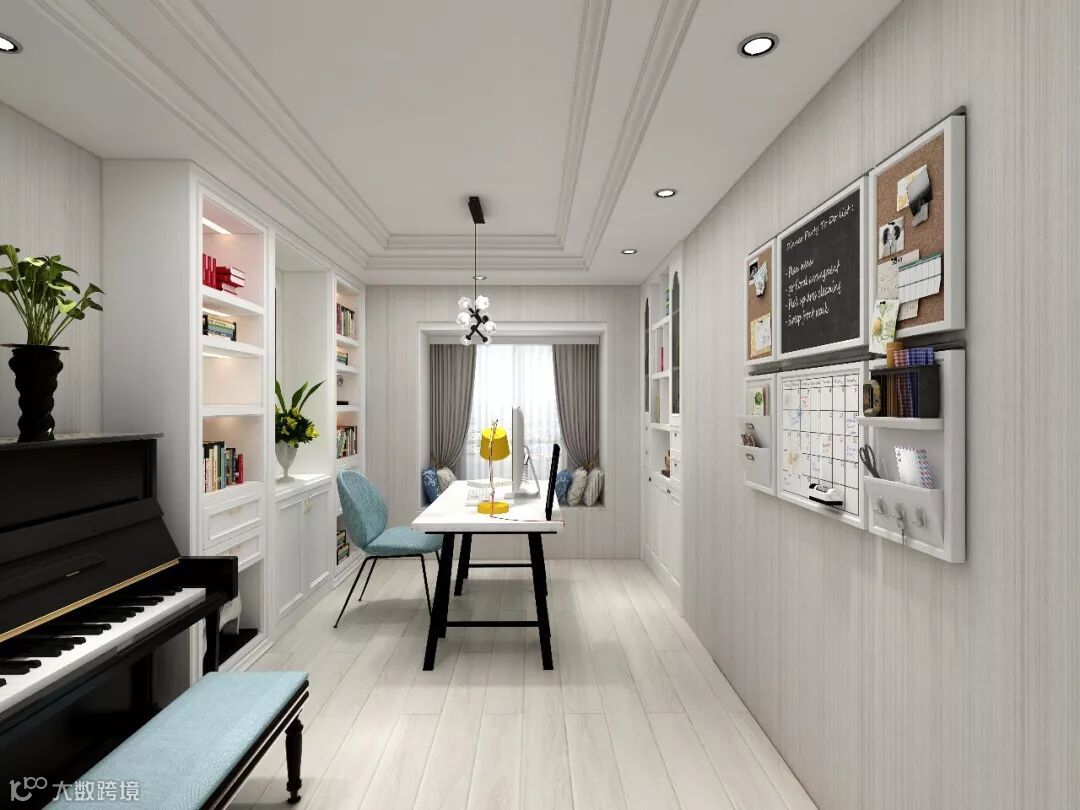 多功能定位的书房,主要用于男主人练琴与办公使用,预留了钢琴的位置与定制书柜,以后则用于小孩的书房也可以。