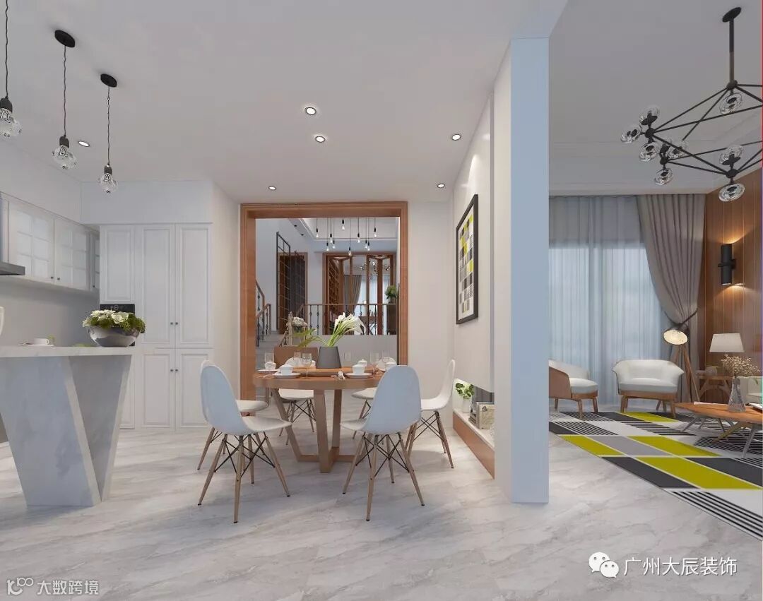 为营造当代北欧的室内空间的意境氛围,大面积的选用了白色仿大理石砖系列,质感稳重同时质地透亮,活跃了空间的形式,整体的空间有了一个完整的灰色基调,内敛稳重,加上家具造型,恰当地表现了新东方的内敛安静的空间精神。