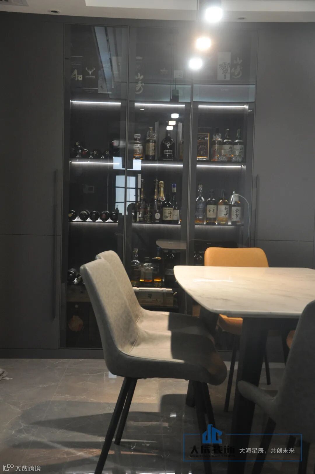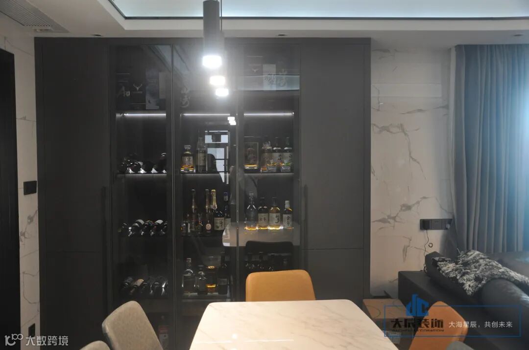 现代简约风格强调功能性,简单流畅的线条,前卫时尚不羁。在黑色基调色基础上,餐椅采用灰色和橙色加以点缀,使得整个空间看起来不那么单调,同时与完美的软装相结合,给人全新的视觉体验。
