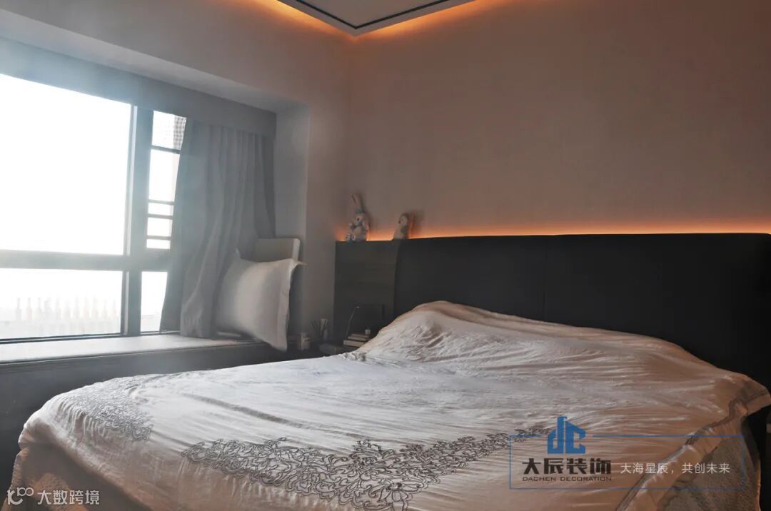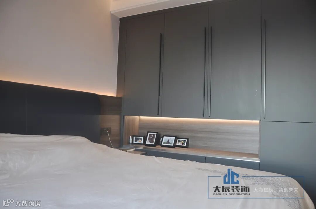 卧室的设计简约没有其他的造型,天花暗藏灯光、床头灯以及衣柜暗灯更显温馨。饰品的使用并不多,但每一个都别具一格,造型、却极具个性化。