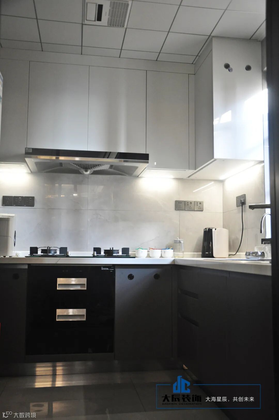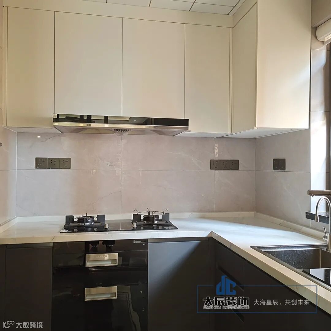 白色的吊柜和黑色的灶台柜完美的结合,一黑一白形成明显的对比。