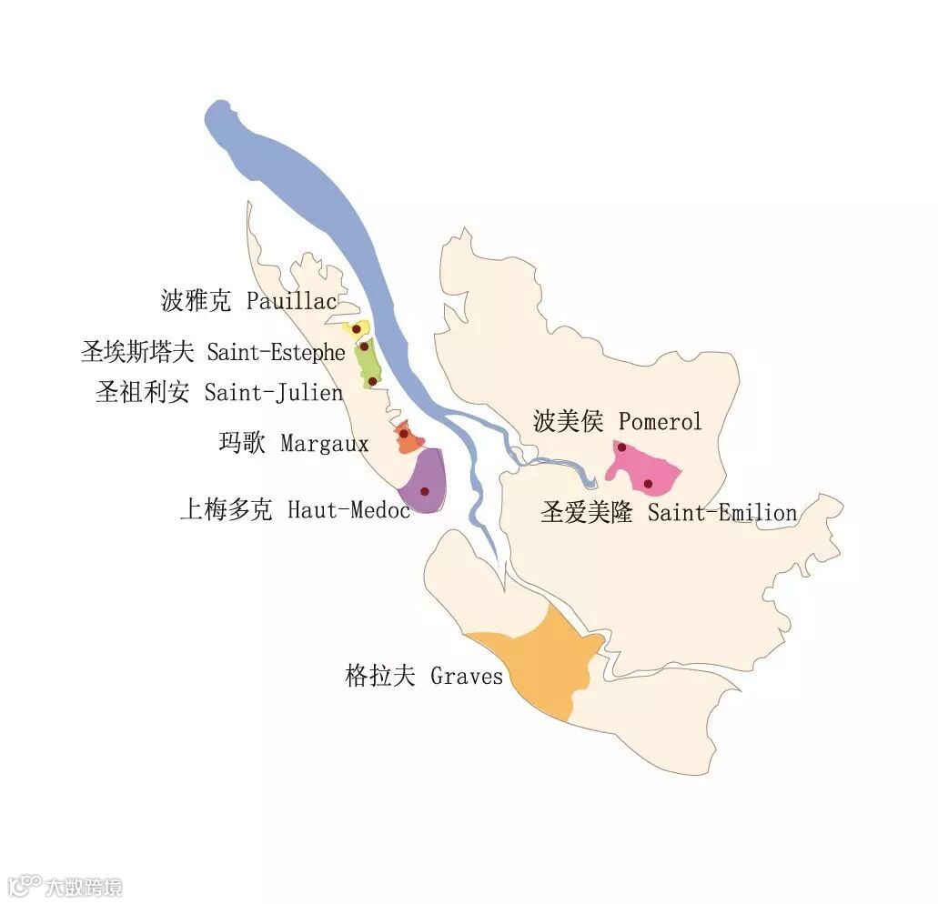 左岸包括:梅多克产区(Medoc)、格拉夫产区(Graves)、苏玳(Sauternes)和巴萨克产区(Barsac),当然最能代表波尔多左岸的还是梅多克产区。梅多克区自1855年始创名庄分级制度成为后来法国各名区分级制度的典范。
