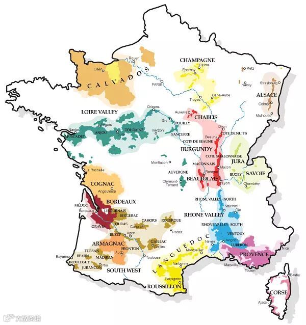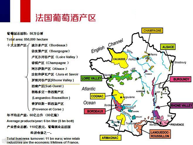 最出名的法国葡萄酒产区主要是:波尔多Bordeaux,勃艮第Burgundy和香槟区Champagne以及阿尔萨斯Alsace、罗瓦河河谷Loire Valley、隆河谷地Cotes du Rhone等,其中又以气候温和土壤富含铁质的波尔多产地最具代表。波尔多以产浓郁型的红酒而著称,而勃艮第则以产清淡型红酒和清爽典雅型白酒著称,香槟区酿制世界闻名、优雅浪漫的汽酒。
