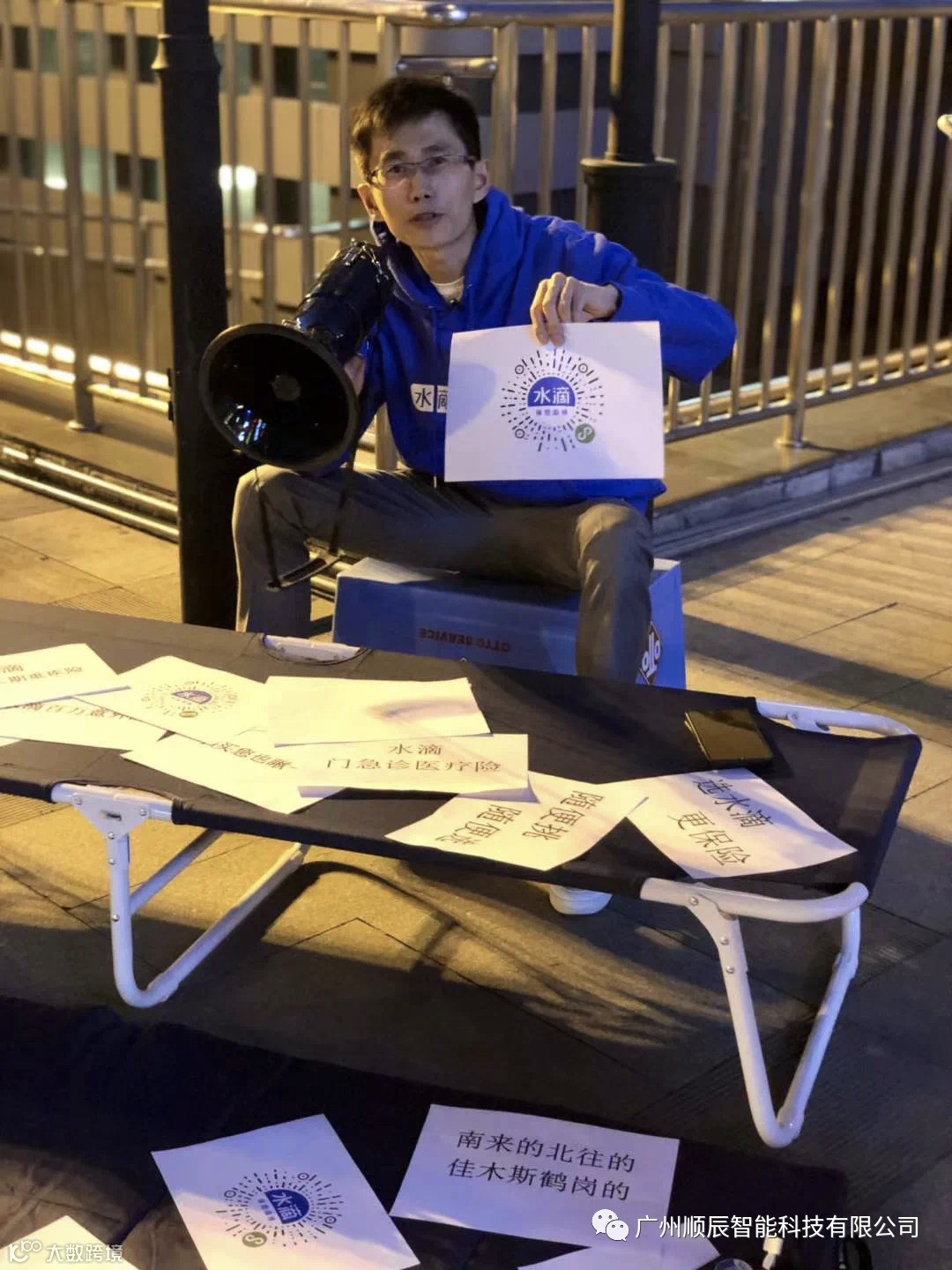 举着一个大喇叭和公司的Logo
