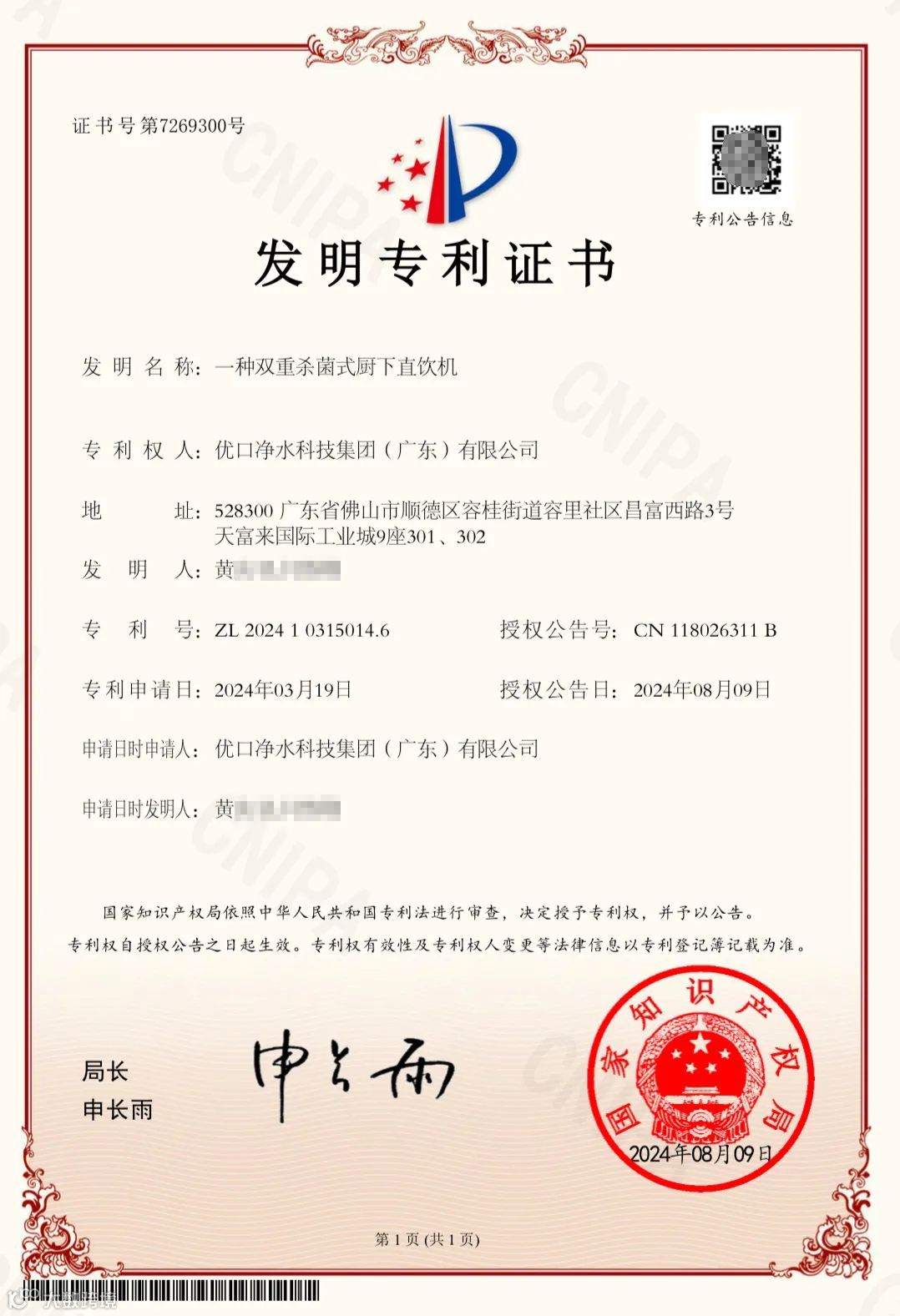 近日,我司迎来振奋人心的消息,其自主研发的“一种双重杀菌式厨下直饮机”发明专利成功通过国家知识产权局的严格审查,正式获得授权,专利号为“ZL 2024 1 0315014.6”。这一里程碑式的成就,不仅彰显了优口净水在技术创新领域的深厚实力,更为公司的发展注入了强劲动力,标志着优口净水在净水技术的创新之路上再次获得高度的认可!