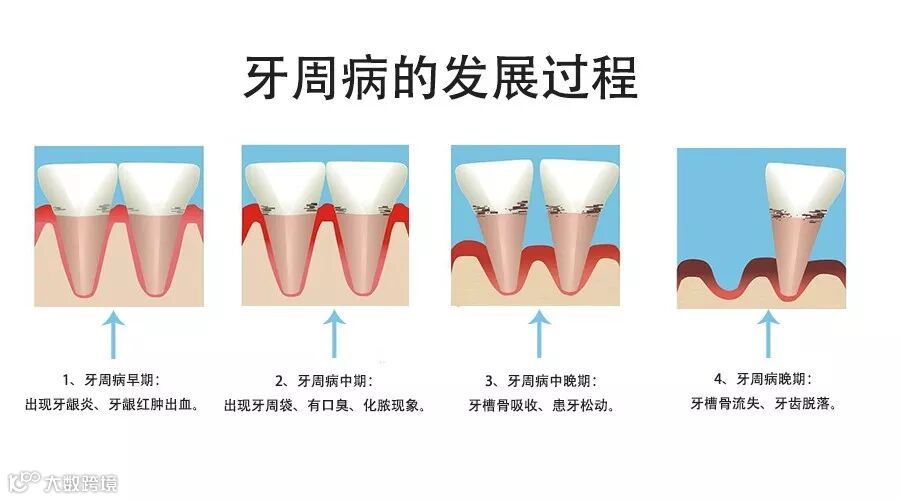 牙周病一般分为早期、中期、中晚期、晚期四个阶段。(如下图所示)