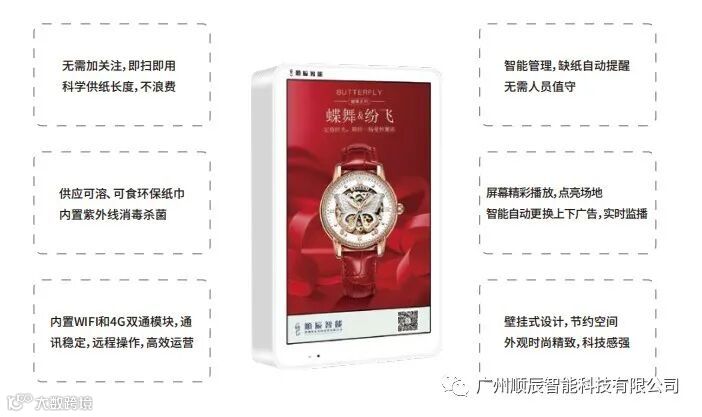 “厕所媒体”要焕发出新活力就必须要有一个合适的媒介,它的更新率高,更换操作简单,成本低,传递的信息量庞大, 还具备多功能,答案就是——顺辰智媒纸巾机,作为厕所媒体的新媒介,它能为广告主选择正确的客户。