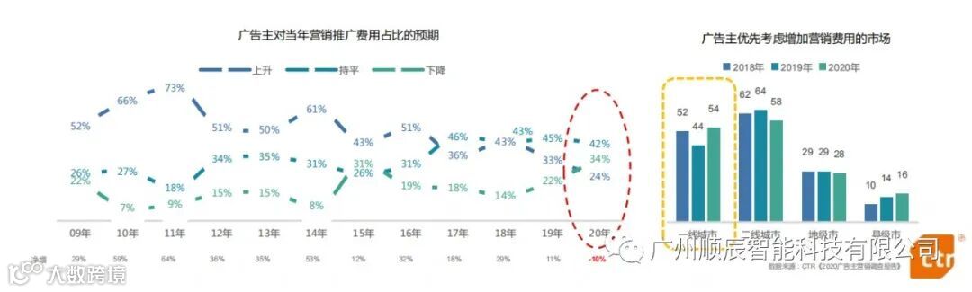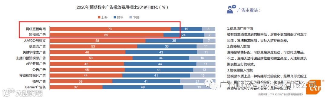 据CTR 8月份发布的《2020年中国广告市场及广告主营销趋势》: