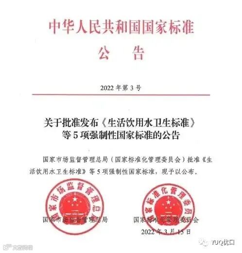 2022版《生活饮用水卫生标准》于近日发布 !将于2023年4月1日正式实施!