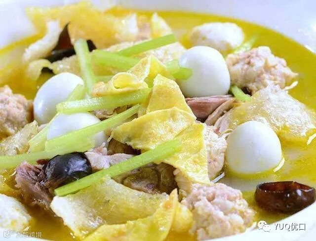 食材:鸡蛋、五花肉、鱿鱼、筒子骨、燕饺、鹌鹑蛋、火腿肠、云耳。姜、胡椒粉、盐。做法:1.筒子骨清洗干净,放入锅中加入清水、姜块熬成浓汤。2.五花肉剁成肉泥,放入容器中加入食用盐,胡椒粉、生粉。3.顺时针方向打至上劲,一半揉成肉丸。4.鸡蛋烫成蛋皮,另一半肉泥平铺在蛋皮上,然后裹上生粉,放到蒸笼中蒸15分钟,然后切成斜刀的形状,平铺在碗底。5.起锅烧油,倒入鱿鱼、肉片、木耳,翻炒后倒入炖好的浓汤中,熬1个小时。6.1个小时后,加入肉丸、燕郊、鹌鹑蛋、火腿肠、胡萝卜,盐、鸡精。7.煮好之后倒入碗中,鸡蛋卷再放在碗里就可以了。
