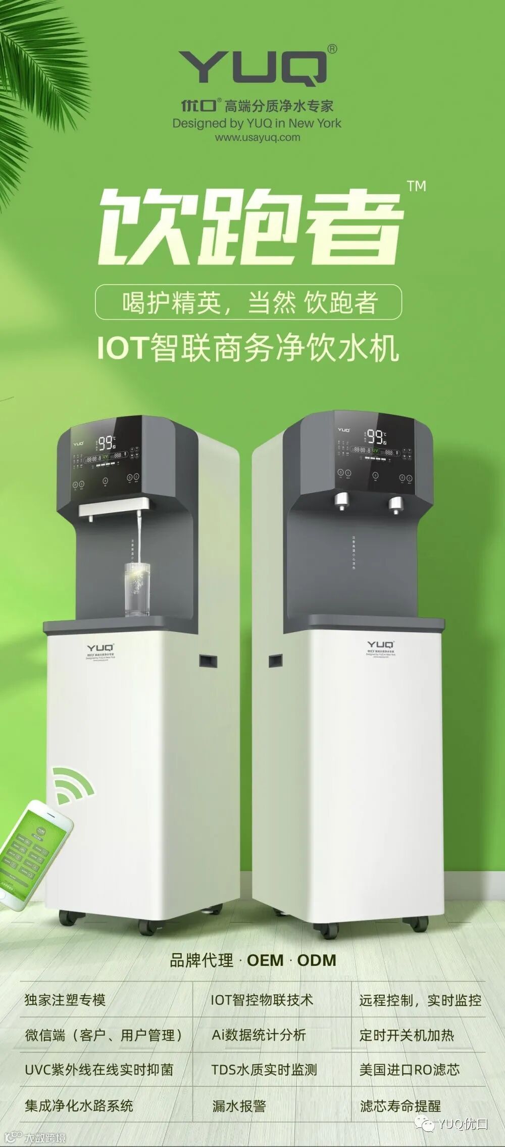 优口此次发布的硬核新品——饮跑者轻商务净饮机,在技术上将IOT智控物联技术和直饮机相结合,让终端用户和运营商都可以通过手机端实时在线监测设备的水质状态、滤芯寿命信息,并且能实现远程控制开关机加热,实时监控、漏水报警等功能。利用便捷的IOT智控物联技术,解决了饮水设备运营维护难、管理成本高等问题。此外,饮跑者采用集成净化水路系统,减少管路漏水的可能性;UVC紫外线在线实时抑菌,保障饮水健康,无菌鲜饮。