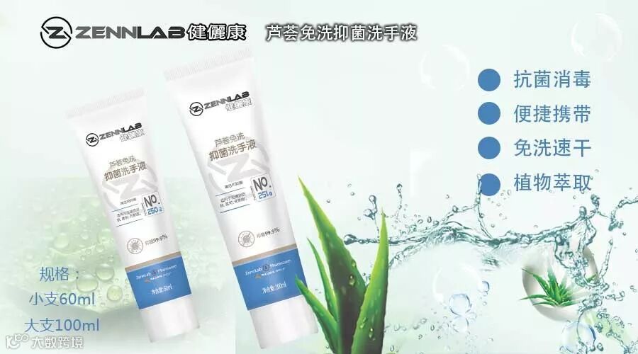 ZennLab健俪康芦荟免洗抑菌洗手液,两种容量可选(100ml、60ml),除了免水洗,还有个优点就是便捷携带,小到可以装进口袋。芦荟萃取精华,温和不刺激抑制细菌,更有效地保湿滋养、保护双手。芦荟具有很强的保湿和抑菌消炎性,有效防止细菌滋生。含75%酒精(乙醇),99.9%有效杀菌。