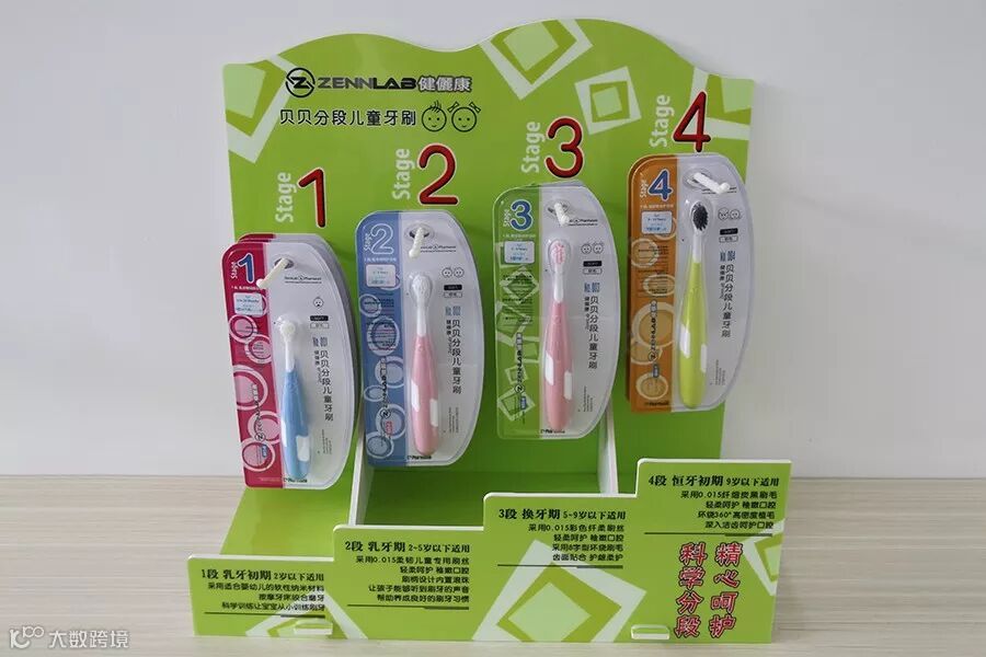 展架一,根据儿童贝贝分段牙刷专门设计,四个阶段的牙刷陈列一目了然。