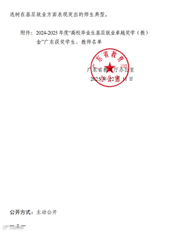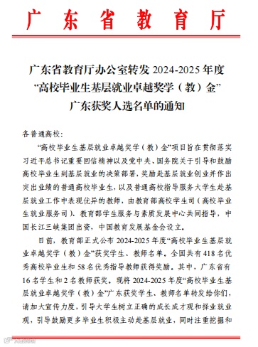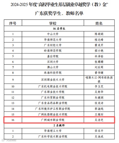 日前,收到广东省教育厅的通知,我校优秀校友吴洁芝荣获教育部2024-2025年度“高校毕业生基层就业卓越奖学(教)金”。这是继去年杨寿锦获得该奖项后,我校毕业生再次捧得该项荣誉!