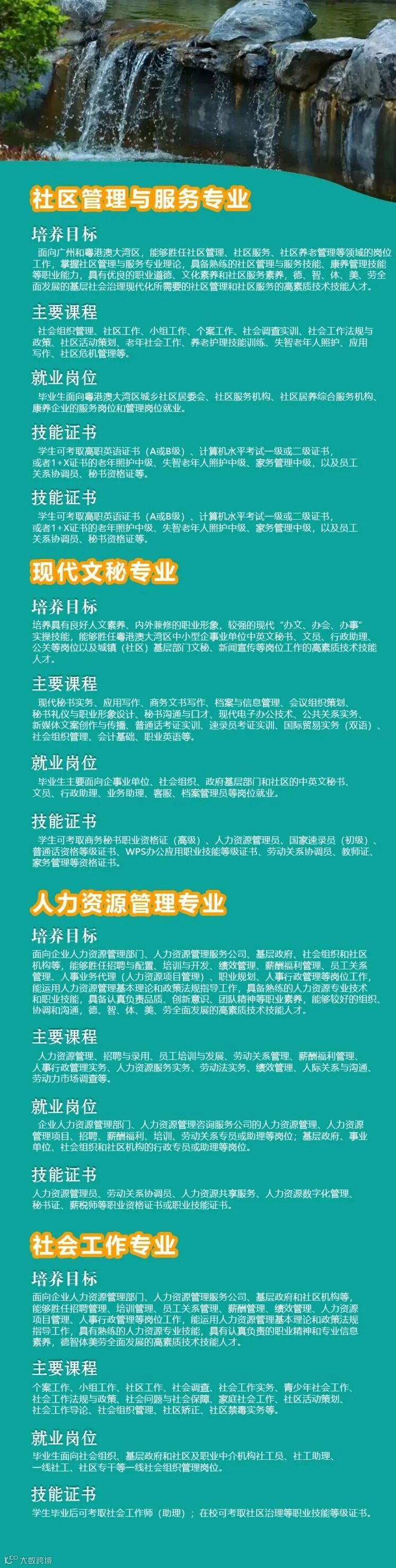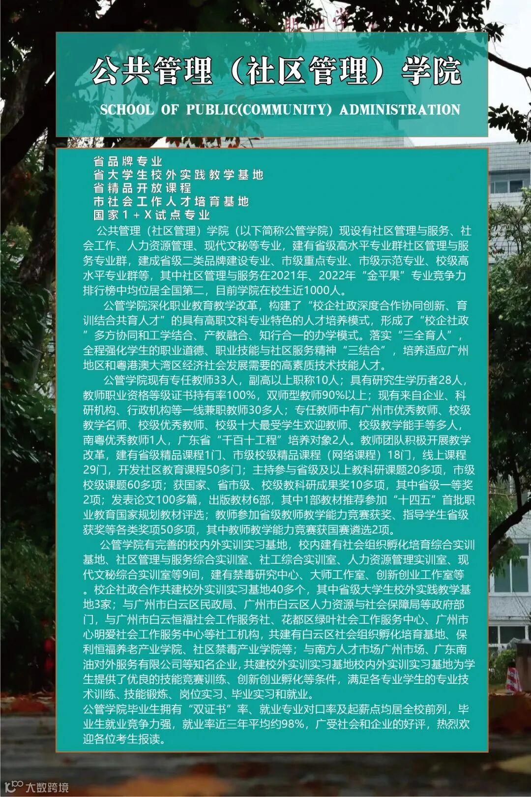 社区管理与服务专业开设于2006年,为广东省高水平专业群的核心专业、校级重点建设专业,2021年、2022年金平果排行榜专业竞争力均居全国第二名。毕业生面向粤港澳大湾区城乡社区居委会、社区服务机构、社区居养综合服务机构、康养企业的服务岗位和管理岗位就业。