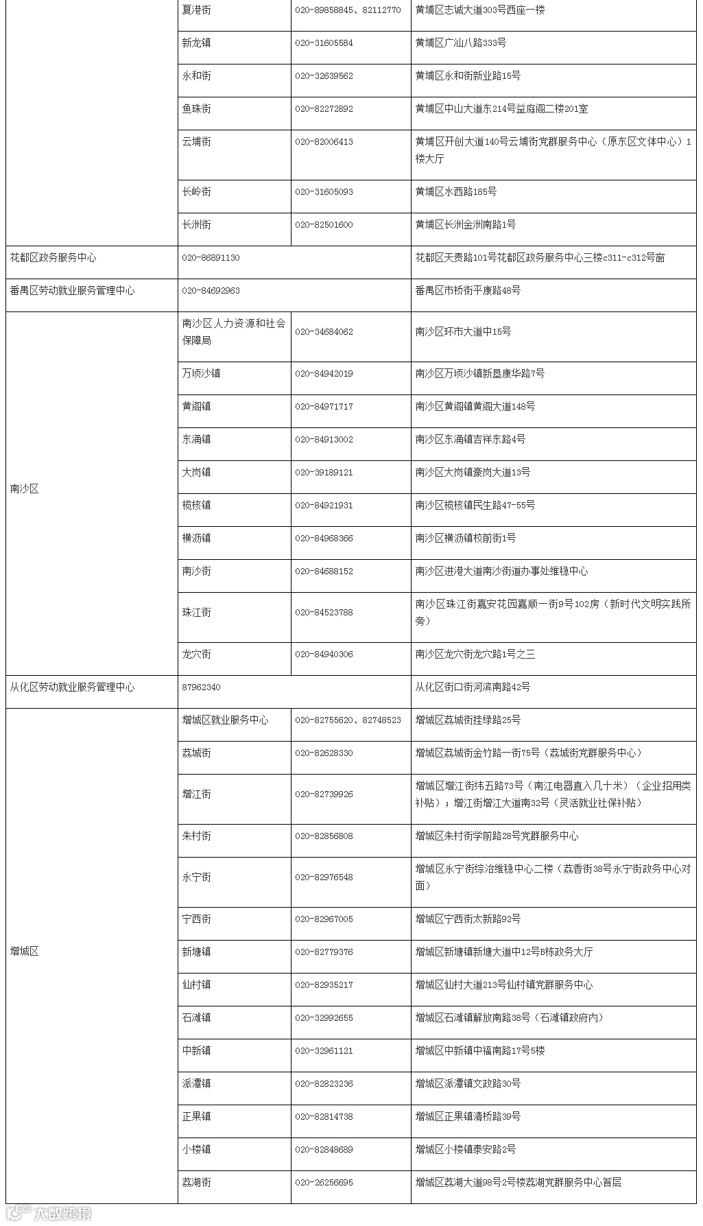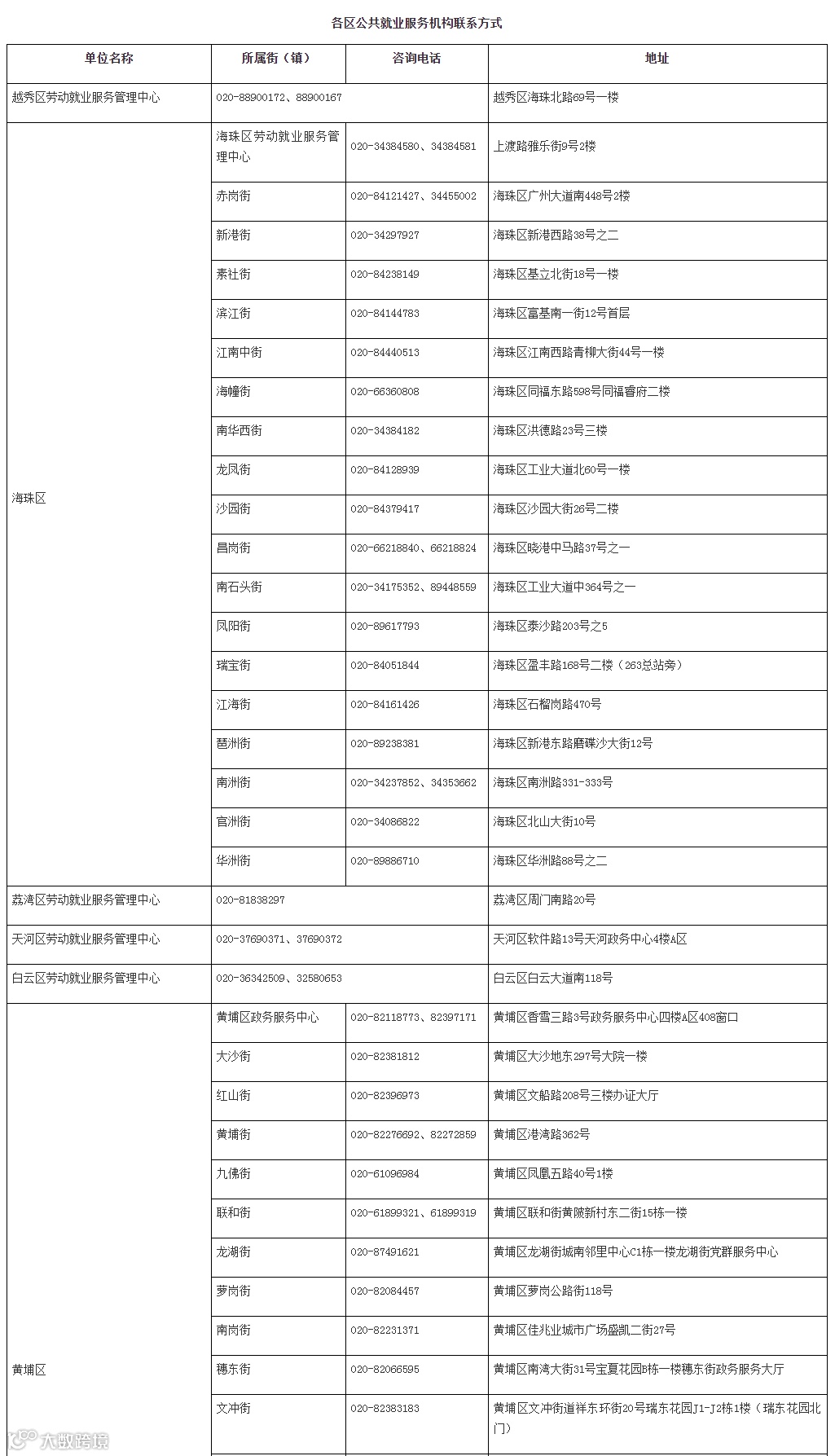 各区公共就业服务机构联系方式