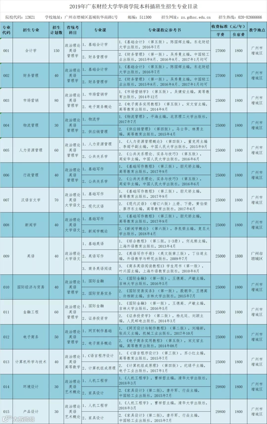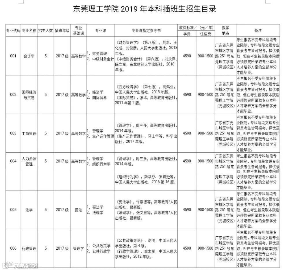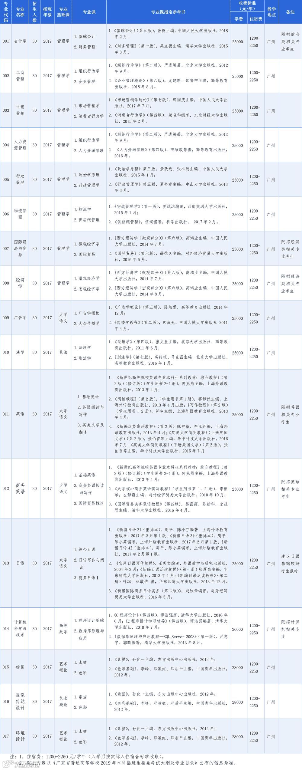 备注:各招生专业、招生人数、收费标准及说明以《广东省2019年本科插班生招生专业目录》为准。