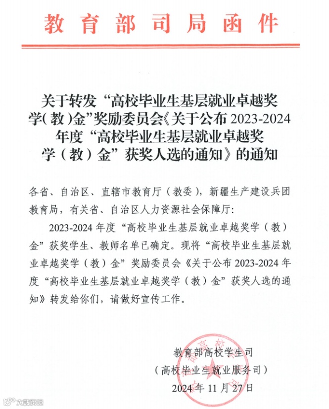 日前,收到教育部的通知,我校优秀校友杨寿锦荣获2023-2024年度“高校毕业生基层就业卓越奖学(教)金”。据悉全国只有398名毕业生获得此项荣誉,而广东省只有16人,杨寿锦就是其中一个。