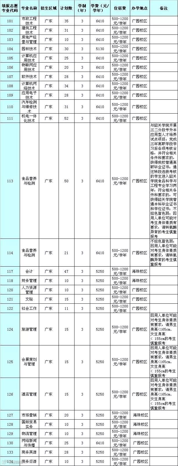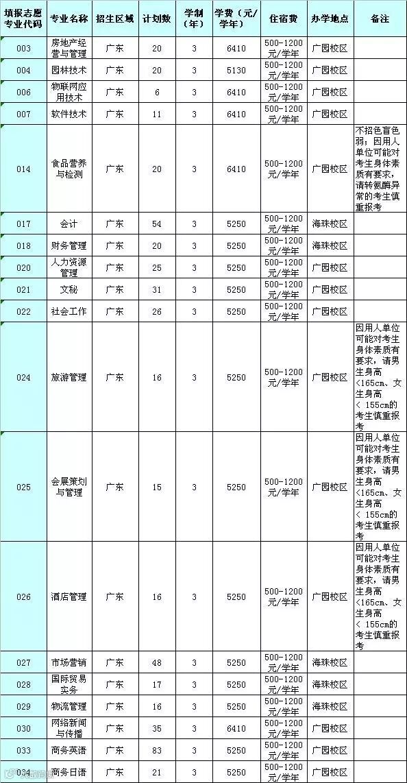 以下各招生专业、招生区域、学费、报考代码(填报志愿代码)、计划数等信息仅供参考,最终以广东省教育考试院公布的《广东省2017年招生专业目录》为准。