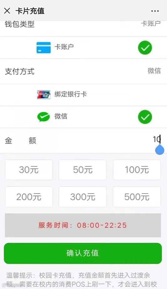 钱包类型默认“卡账户”,也就是给校园卡充值;“校园卡通用电子账户”即一卡通二维码消费账号。支付方式默认“微信”,“绑定银行卡”可用绑定的工商银行卡充值(此功能待开通)。“金额”栏可以输入金额或选择金额数目。