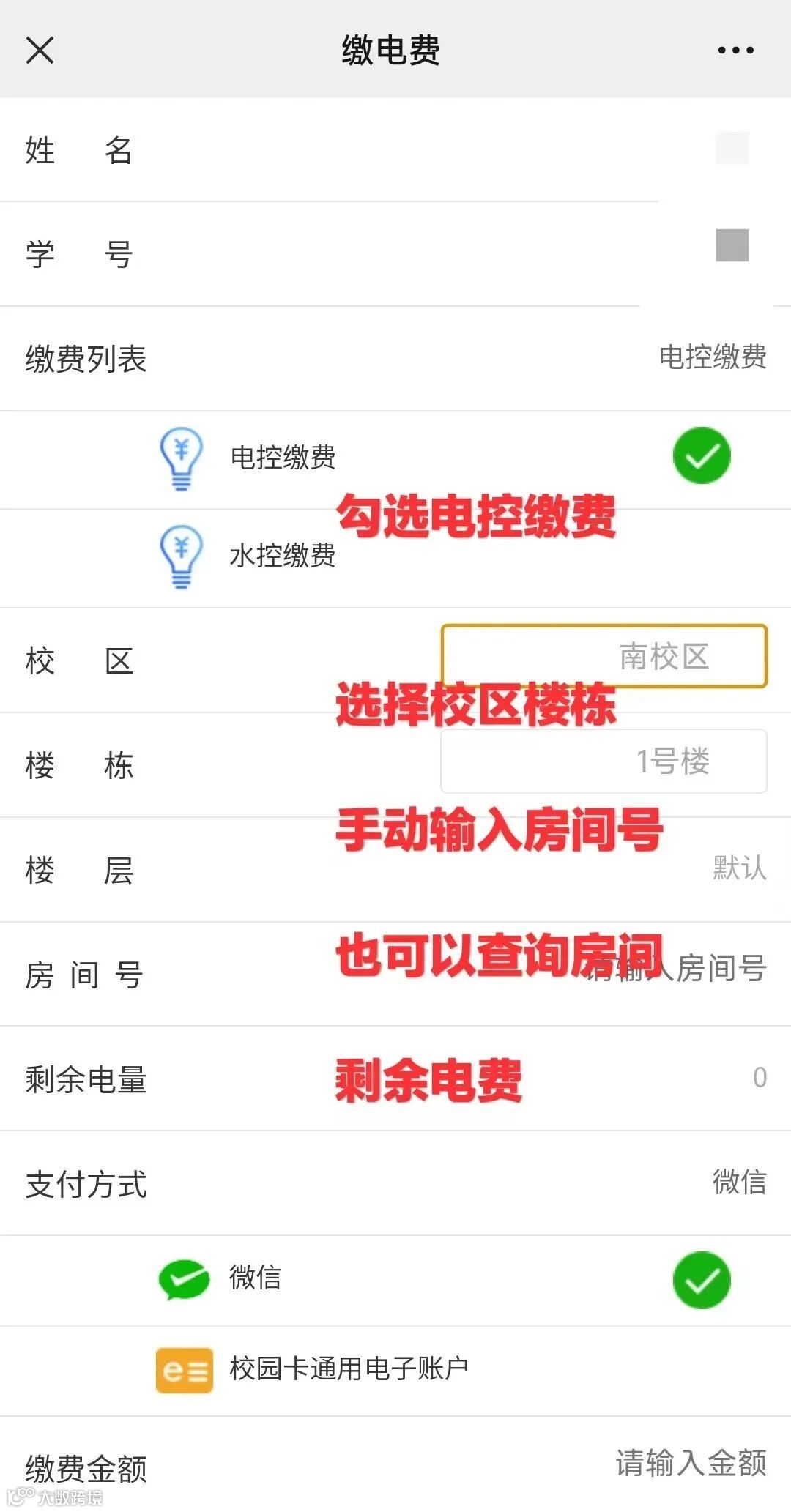 3.选择“自己充值”,输入房间号、充值金额,选择微信支付,点击立即充值。首次成功充值后,绑定宿舍房号,下次充值无需再次选择房号。可支持代别人充值电费。