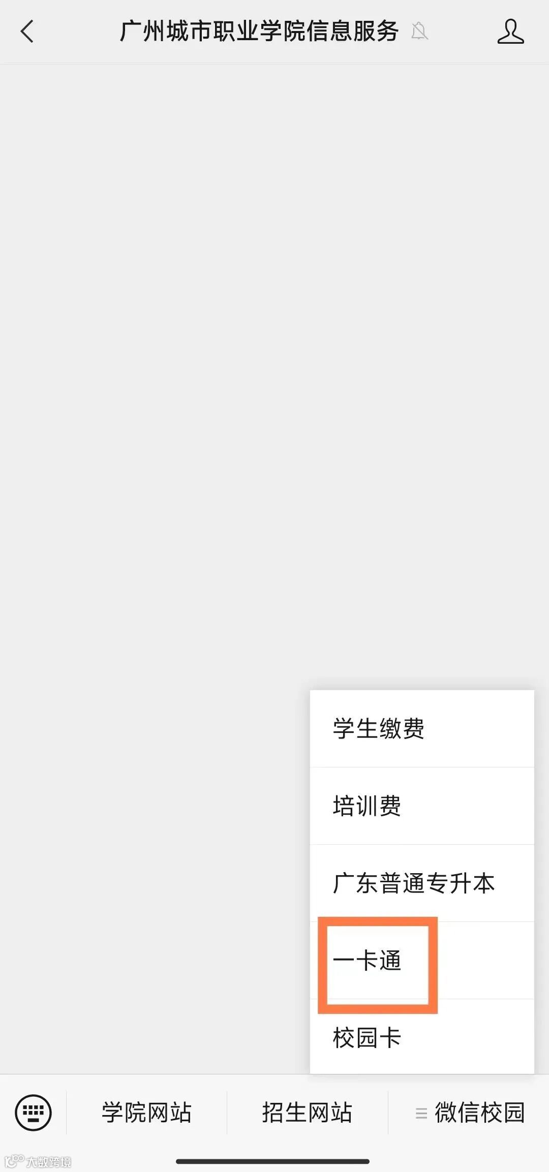 打开微信,关注“广州城市职业学院信息服务”公众号,进入该公众号,选择右下角的“微信校园”后,跳转至“绑定校园卡”;