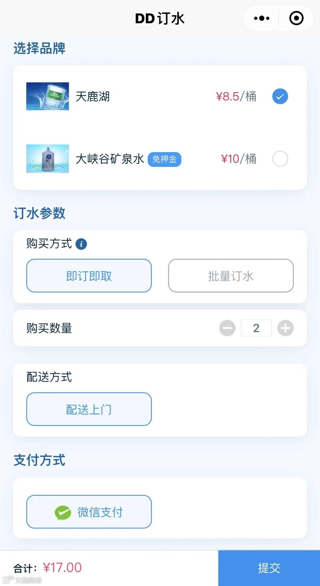 注册完成后根据自己的需求,选择所需的饮用水类型以及数量,付款后等待配送上门即可(配送方式选择“配送上门”)。