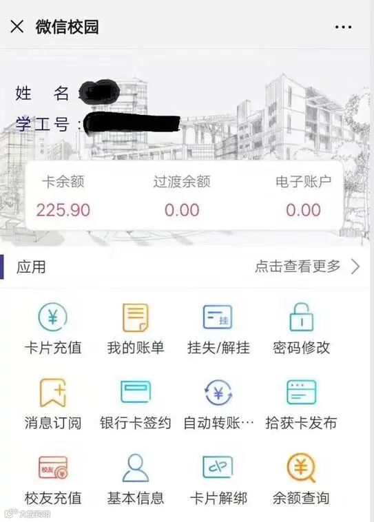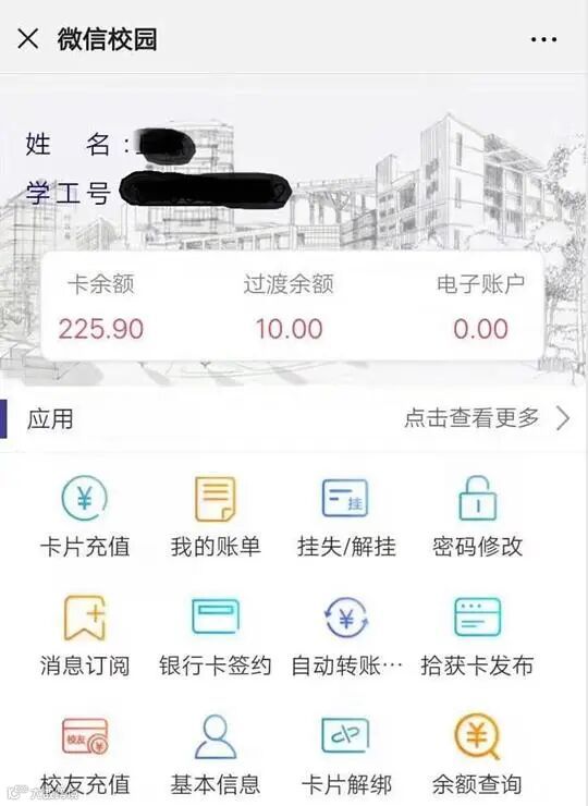 “卡余额”即为校园卡账户中资金;“过渡余额”为充值后还未写入校园卡的资金;“电子账户”可用于一卡通二维码消费的资金(此功能待开通)。
