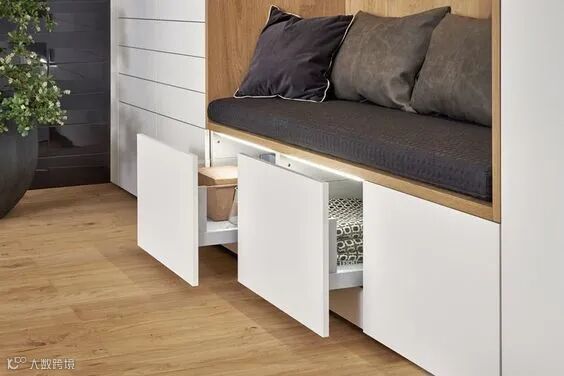 卡座的收纳也很简单,内部留空之后,直接做抽拉式的抽屉收纳即可。