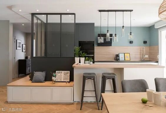 除了餐厅,卡座和厨房的组合也很实用。对于很多小厨房而言,采光差、不通透一直都是硬伤。